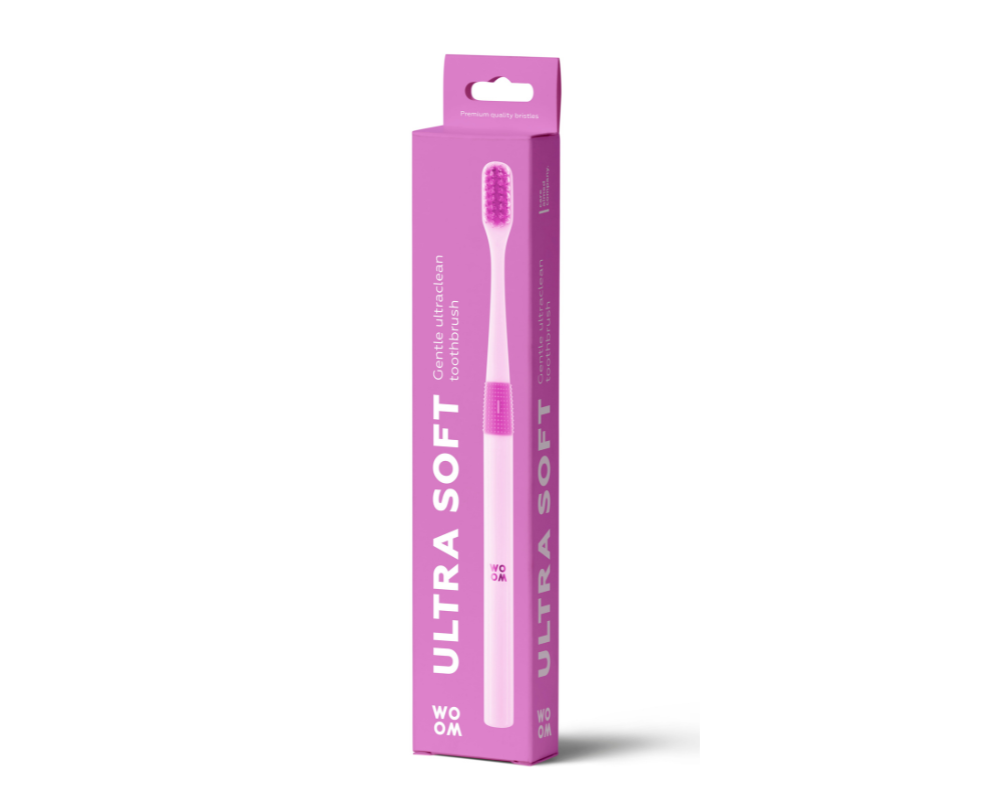 WOOM Ultra Soft rožinis dantų šepetėlis su itin minkštais šereliais švelniai valo dantis, užtikrina sveiką burnos higieną ir malonų naudojimą. 0,01 mm plonumo šerelių galiukai pasiekia tarpdančius, masažuoja dantenas ir valo be diskomforto. Ergonomiška neslystanti rankena ir apvali galvutė suteikia saugumą ir patogumą.